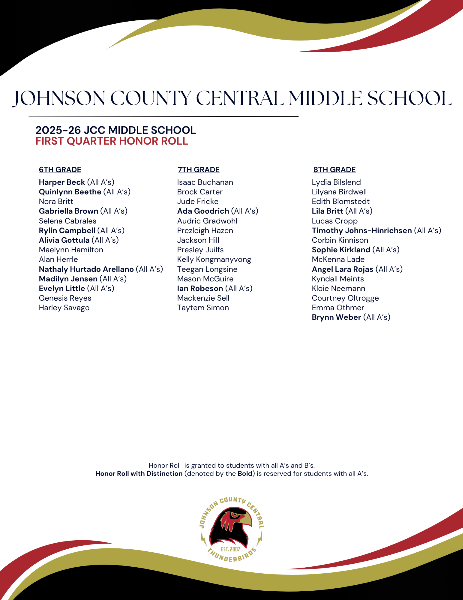 The Johnson County Central Middle School Honor Roll for the First Quarter of the 2025-26 school year have been released.
